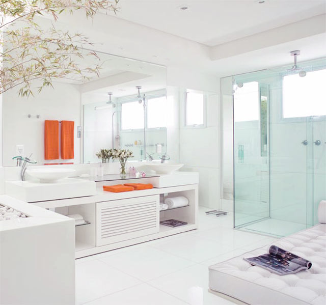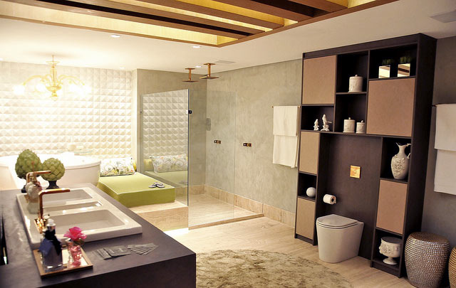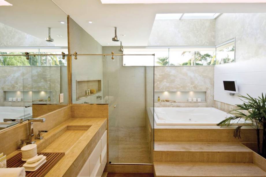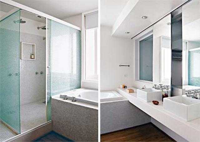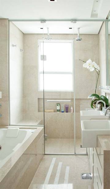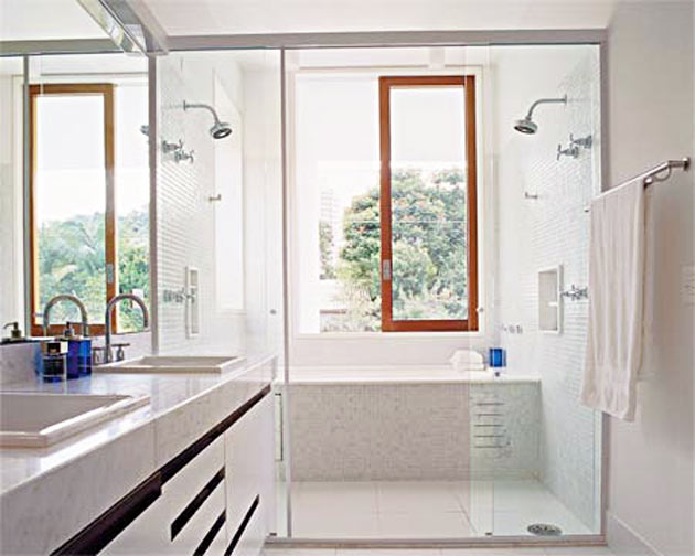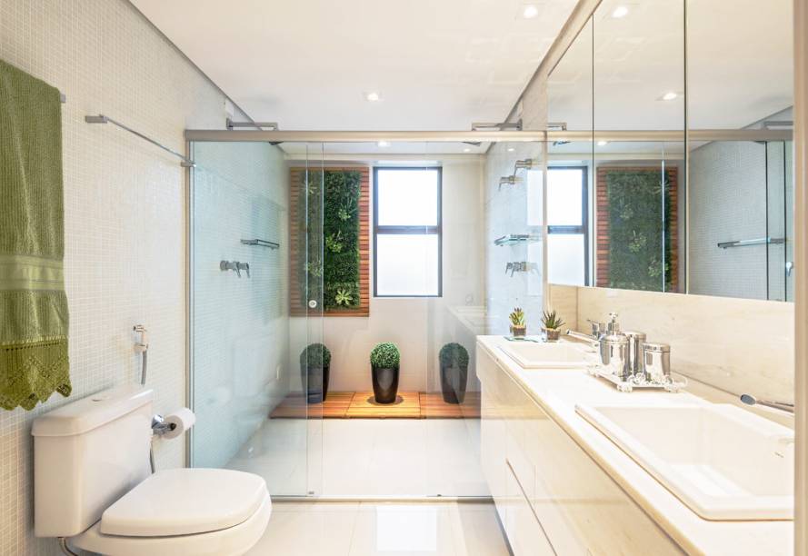 Confira 10 ambientes que combinam os chuveiros duplos com cubas, banheiras, e diferentes layouts e revestimentos.
