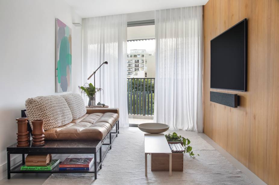 Faça uma janela grande parecer ainda maior. Esqueça as persianas e deixe uma cortina drapeada protagonizar. Isso suaviza a sala inteira.