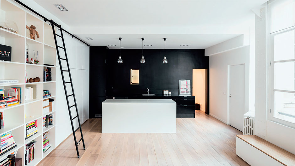 Mal se percebe o misturador. Num canto do loft parisiense de 83 m², criado pelo estúdio Septembre, o ambiente desaparece graças à tonalidade escura da bancada e da parede. Apenas o balcão branco delimita a área. Cooktop e geladeira se escondem atrás do painel claro (à esq. na foto).