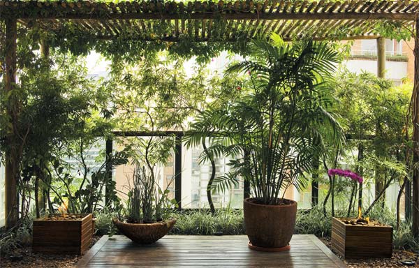 A cobertura em São Paulo dispõe de outras varandas além desta, o que permitiu usar este espaço somente para abrigar as plantas. Ao retirarmos a cerâmica original do piso, encontramos cerca de 35 cm de profundidade, ocupados por argila expandida. Nesse desnível em relação à sala aplicamos terra e fizemos um jardim vigoroso, diz a arquiteta e paisagista Vera Vella, da B2V Arquitetura, que providenciou impermeabilização com manta asfáltica (NDJ Engenharia). Destaque para a pérgula de eucalipto autoclavado (São Paulo Quiosques). Pinos de ferro fixam os pilares no contrapiso e o travamento da estrutura é feito por duas vigas e cerca de 30 caibros na cobertura.
