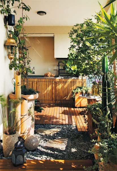 Bambu, madeira, pedras. A paisagista paulistana Paula Galbi descartou componentes sintéticos neste projeto para ser fiel na reprodução da natureza. Não queria que nada quebrasse a harmonia deste espaço de leitura e descanso, diz ela. Ligados por ferro, painéis de bambus (Flora & Arte) ocultam a base da churrasqueira e fazem as vezes de porta do armário abaixo da bancada da pia. A vegetação contempla floração no inverno (jade), outono (bálsamo), primavera e verão (primavera). Orquídeas, cactos e suculentas também emprestam suas flores em diferentes épocas.
