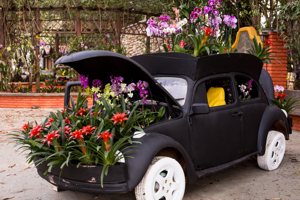 O que é mais cool que o carro símbolo do retrô, com pintura customizada e um monte de flores dispostas como uma headpiece da Carmen Miranda? E sim, dá para sentar no banco do passageiro e fazer fotos nele.