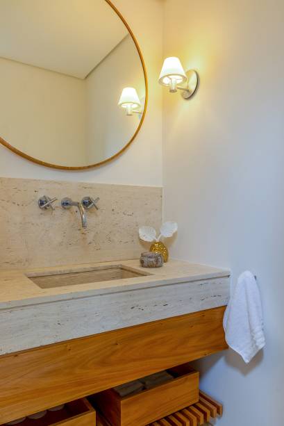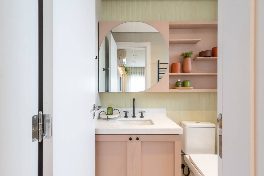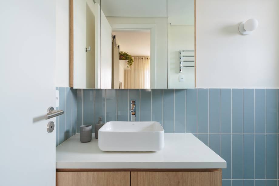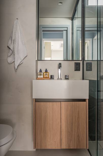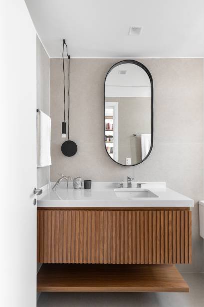 A dica ao colocar armários em banheiros pequenos é fazê-los suspensos, garantindo, assim, a sensação de amplitude. Atente-se também para o material, por ser um ambiente úmido, ele precisa ser resistente ou você terá uma peça danificada em pouco tempo.