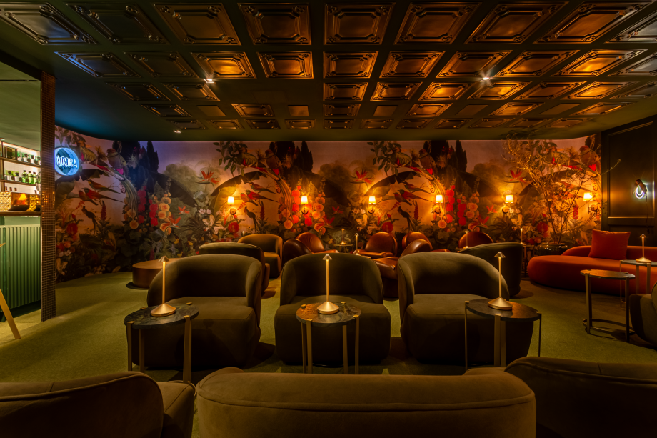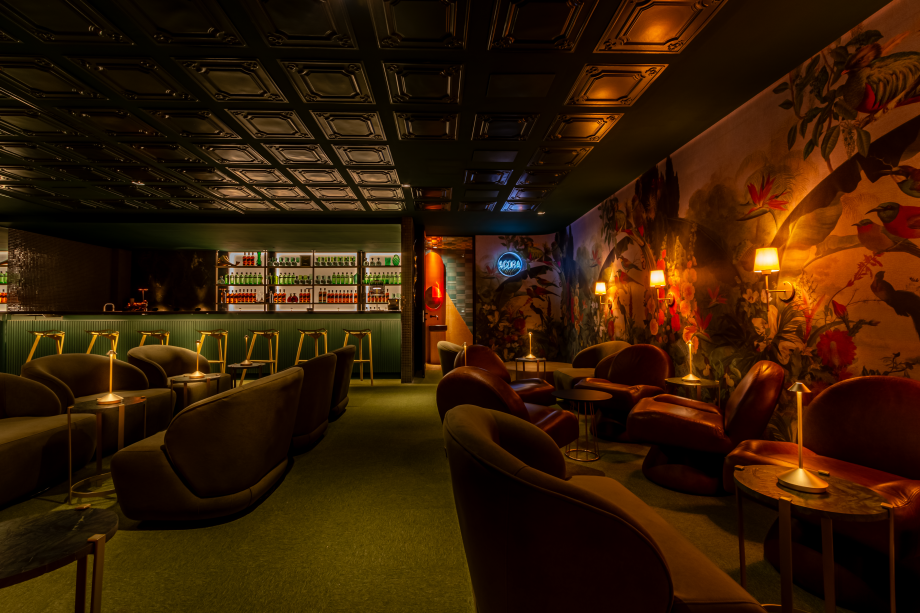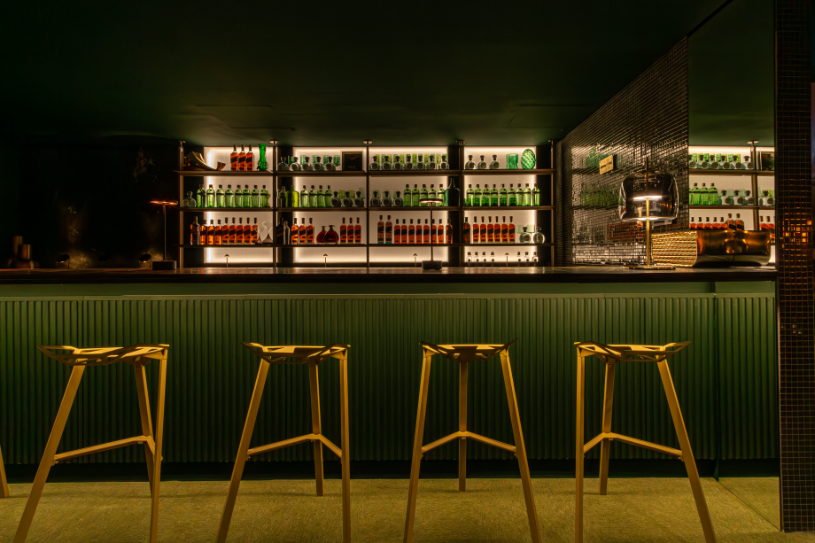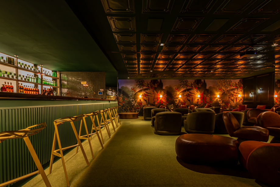 “Foi dali que busquei inspiração para o uso das cores, equilibrando tons, como o verde-escuro e o bordô, a fim de criar a sensação de que estamos num bar de hotel, exclusivo e privativo. Sob uma óptica disruptiva, seu trabalho atemporal ajuda a nos tirar da realidade, causar um choque”, conta o arquiteto.