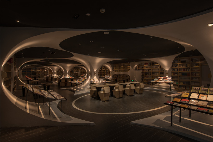 Moderna, a biblioteca tem luz baixa, ambiente aconchegante e elementos futurísticos – tudo projetado pelo escritório de arquitetura XL-MUSE