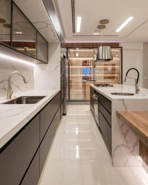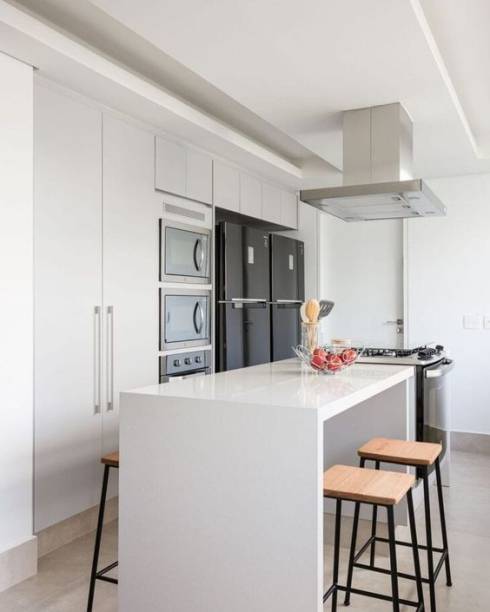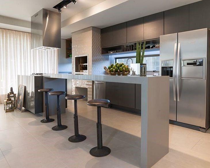 Isso também convida as visitas para acompanhar o preparo do jantar com um bom vinho e garante mais espaço para todos se acomodarem em uma grande reunião. Veja algumas inspirações abaixo: