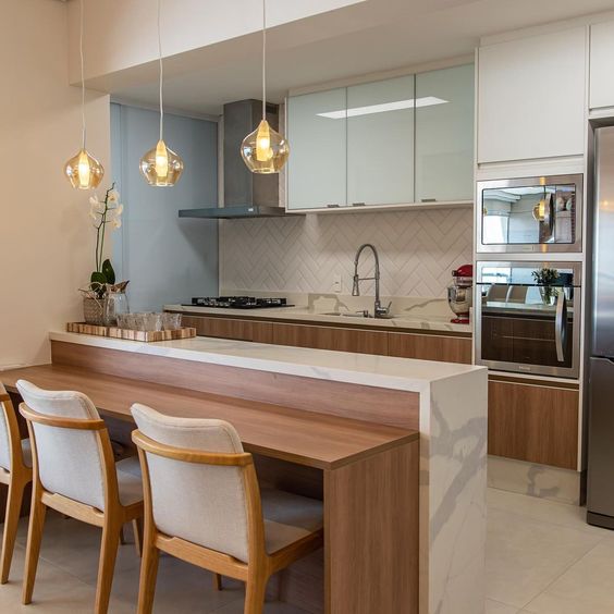 Também há espaço para toques modernos em cozinhas com ilhas. Aqui, são bem vindos designs mais clean, com linhas retas e algumas formas geométricas. Além disso, você pode brincar com texturas nos revestimentos para trazer mais personalidade ao espaço.
