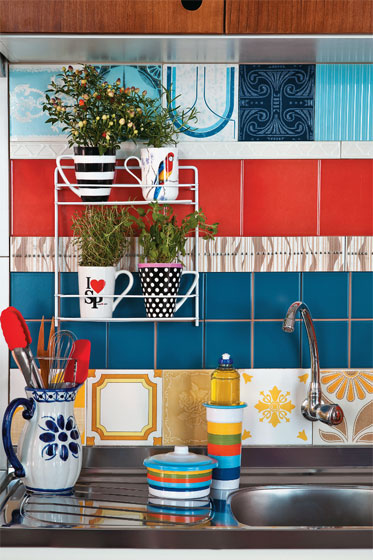 Não há escapatória: muitas vezes, cozinha e área de serviço têm de conviver lado a lado. Por sinal, em um espaço que costuma ser pequeno e estreito, do tipo corredor. Se a circulação for planejada, os móveis e eletrodomésticos bem escolhidos e a disposição pensada para agilizar as tarefas, a área pode ficar charmosa e funcional do jeito que você sempre sonhou. Quem recebeu a missão de montar um ambiente pautado por essas exigências foi o repórter visual Paulo Lagreca, que contou com a consultoria do designer de interiores Fabio Galeazzo, de São Paulo. A lavanderia foi isolada atrás de uma porta de correr de vidro, que pode ser coberta ou não por película adesiva branca translúcida só depende do quanto se deseja camuflar o tanque e o varal. Em ambas as soluções, as roupas ficam protegidas da gordura e a claridade que vem de fora chega até a cozinha. Nesta, a customização com adesivos, o minijardim de temperos, o quadro-negro na parede e o patchwork de azulejos acima da bancada da pia foram algumas das sugestões de Fabio, que faz o convite: É tempo de bom humor! Por que não deixar esse estado de espírito transparecer na decoração?
