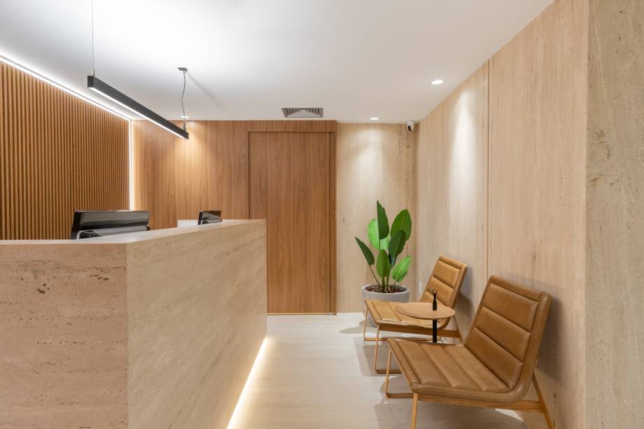A recepção foi concebida para ter dois fluxos independentes para que a equipe não precise transitar em frente aos clientes que aguardam na sala íntima, outro destaque do projeto. Rodeada por uma extensa biblioteca, oferece um ambiente acolhedor e intelectualmente estimulante.