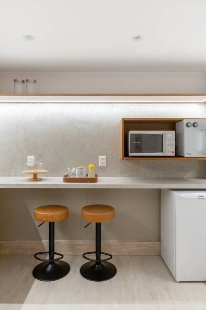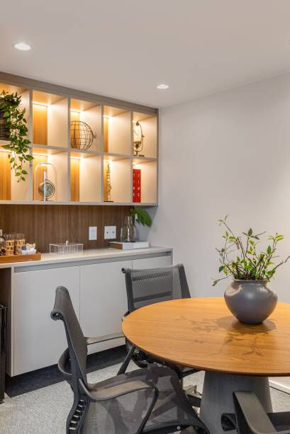 A esse ambiente principal foram integradas duas copas, cada qual com uma finalidade específica: uma foi projetada para atender às necessidades dos funcionários e dos sócios e oferecer um lugar prático e confortável para as pausas e refeições. A segunda foi pensada para acomodar os clientes em reuniões descontraídas.