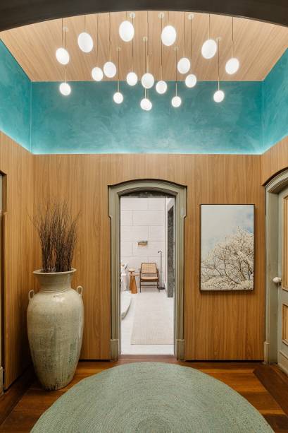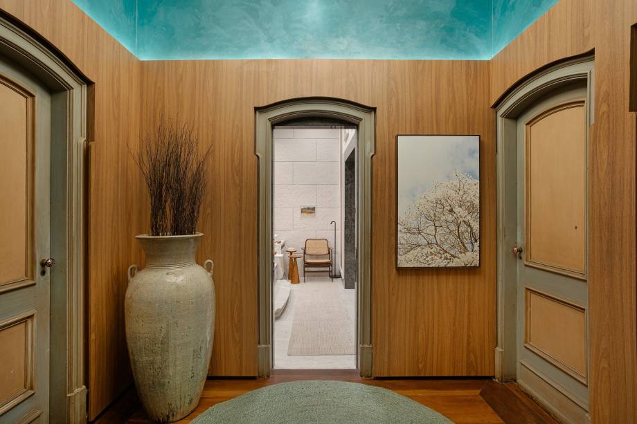 No hall que dá acesso aos quartos, a ideia foi projetar uma área de transição do salão da escada para os aposentos. “Como em todos os meus projetos, o uso de elementos naturais é muito presente aqui, mas com a ideia de serem neutros”, explica Rafael. Nesse caso, o uso da madeira, revestimento cimentício e pintura com efeito velvet são os responsáveis por trazer essa atmosfera natural.