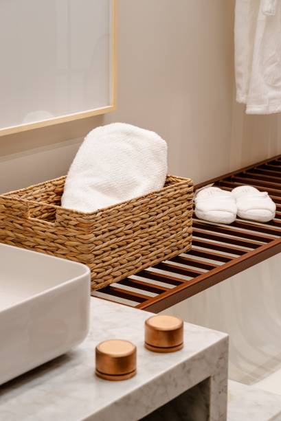 “Em tese, rouparias tendem a ser simplesmente funcionais, mas, para o nosso ambiente, criamos um conceito mais acolhedor e convidativo”, explica. “Usamos telas com registros feitos por Felipe Alvarez e Ari Kaye e a icônica poltrona Oscar, criação de Sérgio Rodrigues. Esses elementos, juntamente a detalhes ricos e elementos nobres, criam um novo conceito para esse tipo de ambiente”, finaliza Rafael.