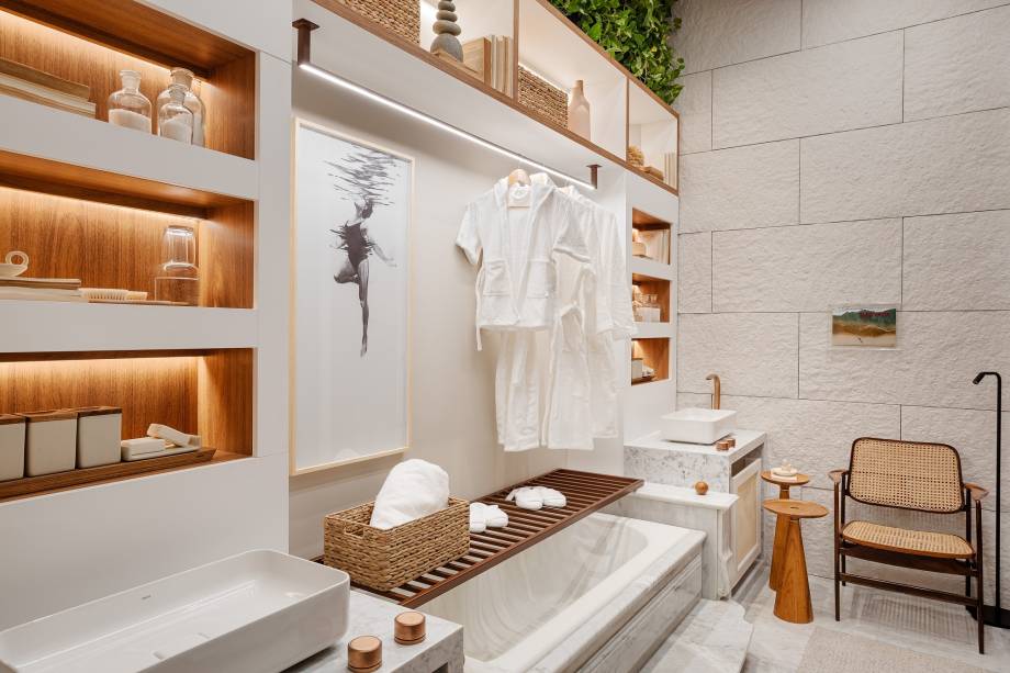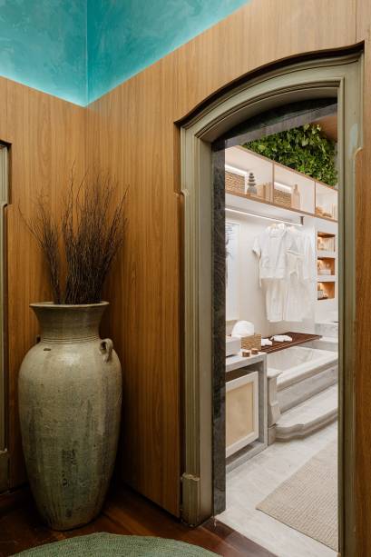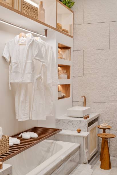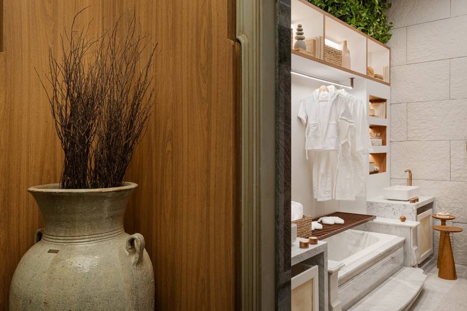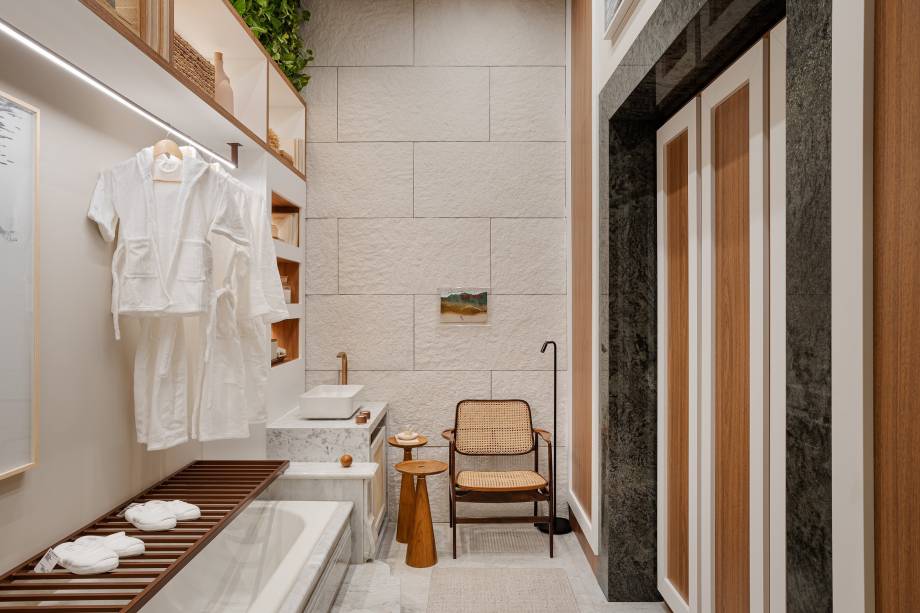 Na parte da rouparia, o mesmo cimentício é usado, criando unidade. Contudo, um detalhe ganha destaque: um jardim vertical traz frescor ao projeto. Conciliados a esses elementos, há também a presença forte de pedras naturais, como mármore carrara e quartzito esmeralda.