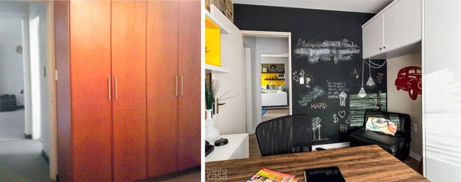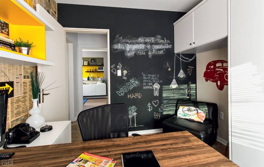 Quando o casal trabalha lado a lado, o projeto requer organização e espaços confortáveis para ambos. A reforma também deixou o home office cheio de personalidade