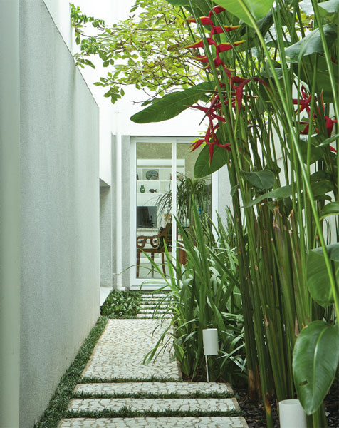Na entrada desta casa paulistana – projeto do arquiteto Gilberto Belleza -, um jardim sombreado dá as boas-vindas. “Praticamente vazio, ele não era nada convidativo”, lembra a moradora, Andrea Guerra. As poucas árvores existentes foram preservadas e o espaço ganhou vegetação que se adapta à baixa insolação. “Selecionei plantas com diferentes tons de verde”, afirma a paisagista Maria Helena Cruz. O canteiro principal mescla as espécies mantidas com arbustos de pleomele – de folhas mais amareladas – e de íris, rentes ao muro. No chão, forrações de hera e de liríope. Diante da fachada moderna revestida de fulgê, o canteiro de lírio-da-paz floresce à meia-sombra. Minigrama-preta rodeia o caminho de mosaico português.