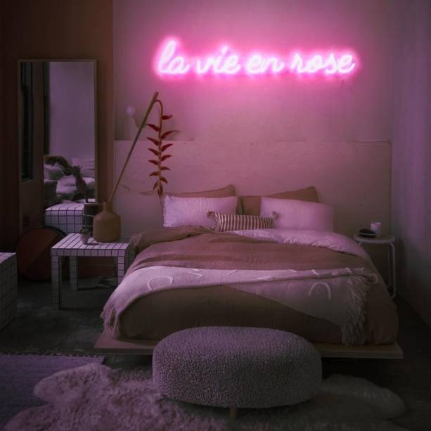 Utilizar itens em neon para compor a decoração cria uma atmosfera bastante moderna no ambiente. Para garantir aconchego, é importante fazer a combinação de maneira equilibrada a fim de não sobrecarregar o espaço – já que o quarto é sinônimo de refúgio e descanso.