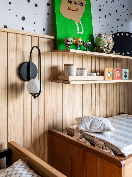 A escolha pelo uso da madeira pinus, mais clara e natural, foi fundamental para refletir aconchego e não pesar o cômodo. O material foi utilizado no berço, trocador – os dois da Ameise Design -, beliche e detalhes na parede. No piso, boa parte da superfície foi coberta por um tapete que segue a paleta do ambiente.