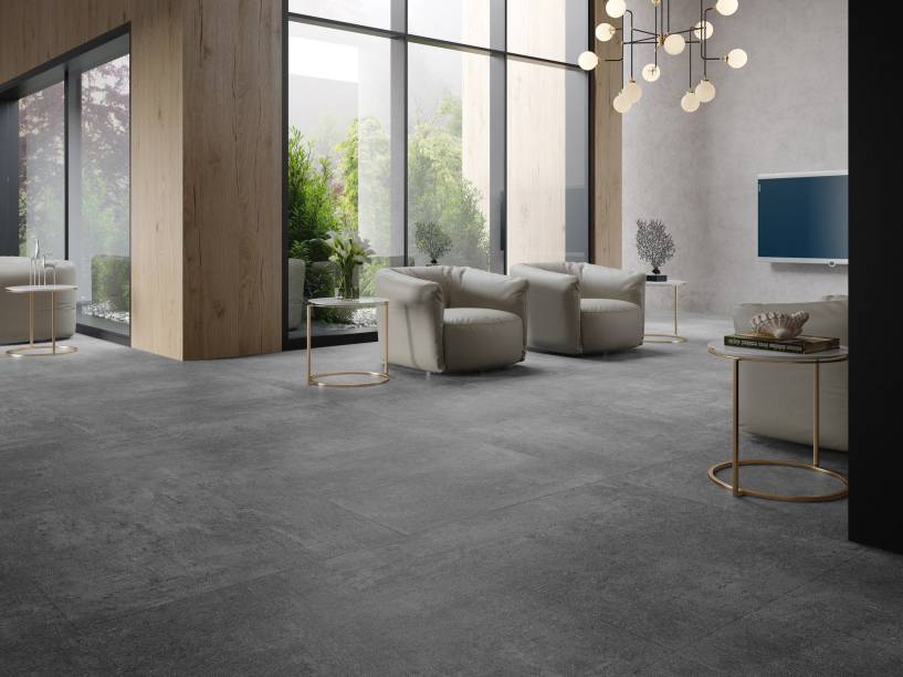 - A Linha Ambienta Coleção Stone ganha as cores Galena e Iron One no formato placa 92 x 92 cm.