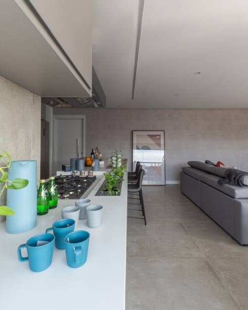 Quando falamos de espaços sociais, como as salas de estar e cozinha, há um outro aspecto. Integrados, os ambientes permitem a extensão da função – quem assiste TV pode interagir com quem cozinha e, quando a refeição estiver pronta, todos podem se reunir na sala para desfrutá-la.