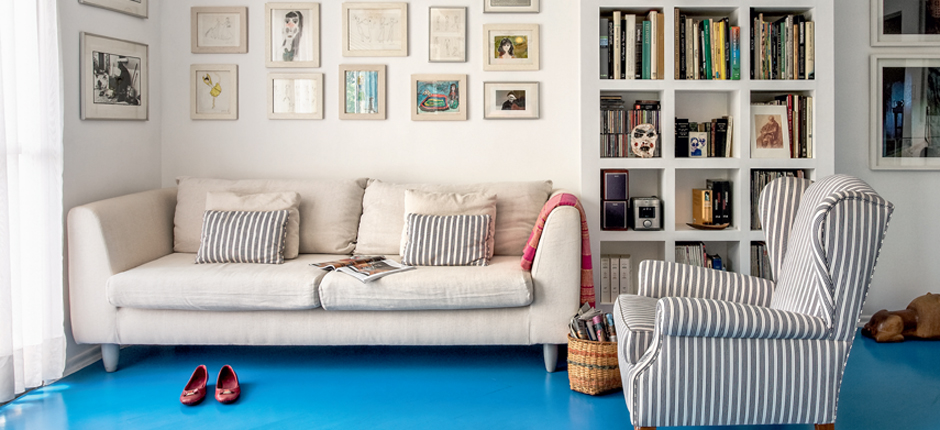 Do piso de tom marfm, restou apenas uma discreta silhueta. Agora oculto embaixo de várias camadas de azul, ele rejuvenesceu. “Em Paris, nos anos 70, era comum os jovens tingirem o chão de madeira dos imóveis recém-alugados de forma a disfarçar o desgaste. Além de dar cor, o truque fcava mais em conta do que recuperar o assoalho original”, conta Alain Brugier, fotógrafo francês radicado no Brasil e autor desta ideia, realizada no living de seu apartamento, em São Paulo. A falta de produtos específcos para esse fim não assustou Alain, que investiu no epóxi à base de água. “Ele é adequado ao uso em madeira, mas dê atenção extra ao lixamento, etapa fundamental para fornecer uma superfície livre de elementos que podem impedir a perfeita aderência da tinta e causar manchas e desplacamento”, conta José Humberto Souza, gerente de assistência técnica da Sherwin-Williams. Abaixo, quatro dicas para obter um resultado tão lindo quanto o da foto acima.
