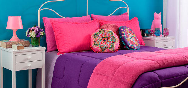 – Edredons de casal: roxo, de malha (Zelo, R$ 109,90) e rosa, de fleece, usado como manta (Pernambucanas, R$ 149).
