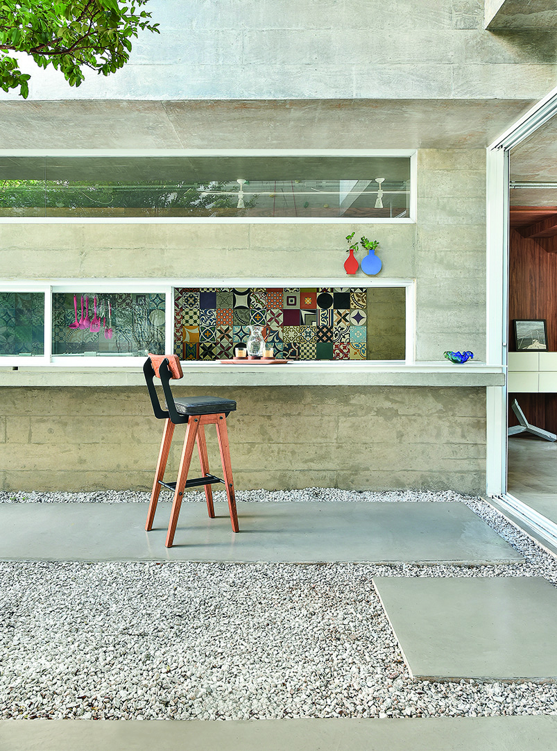 5/7 Concreto, azulejo e outros elementos que fizeram história na arquitetura brasileira ajudaram a dar forma à casa projetada pelo arquiteto Luiz Paulo Andrade. Do lado externo, réguas de concreto feitas na obra com pranchas de madeira desenham as paredes, lixadas para ganhar aspecto manchado. “Uma camada de óleo hidrofugante serviu para selar a superfície e protegê-la da água”, explica o profissional. A mesma matéria-prima em placas cimentícias retangulares demarca o caminho sobre os pedriscos. (Sidney Doll/Divulgação)