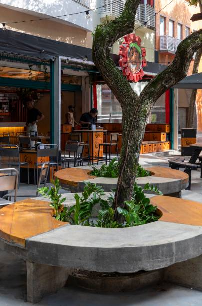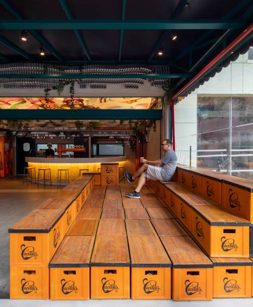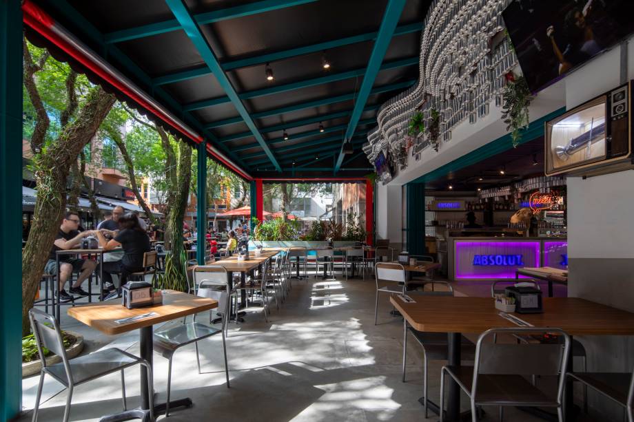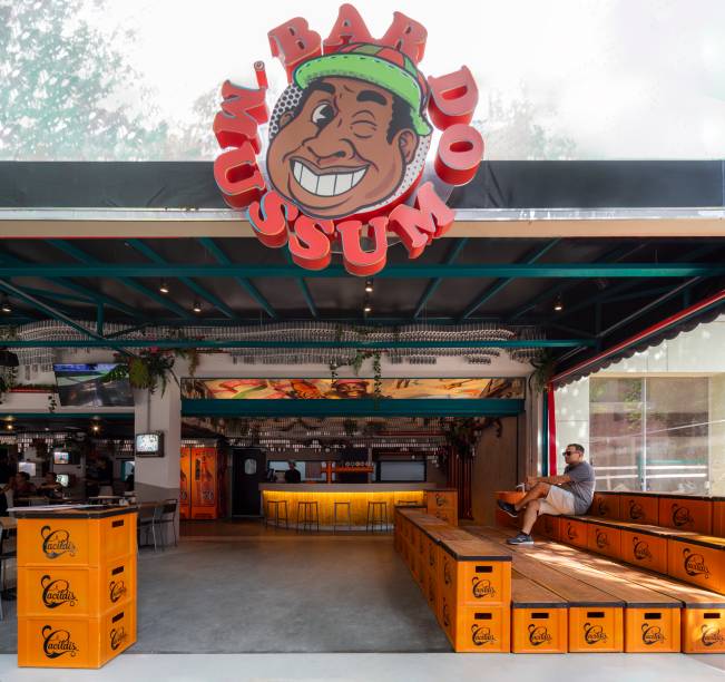 Para potencializar a atmosfera de boteco que o Bar do Mussum pedia, a área externa seria essencial. Localizado em um shopping a céu aberto, o bar tem sua fachada voltada para um boulevard. Ali, os visitantes aproveitam ao ar livre, principalmente nos momentos de roda de samba. Engradados de cerveja foram usados como mobiliário, compondo com mesas e cadeiras leves, que facilitam a adaptação do bar conforme a dinâmica de cada dia.
