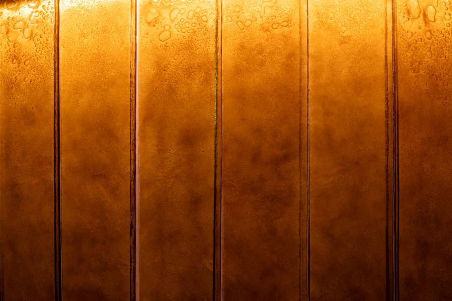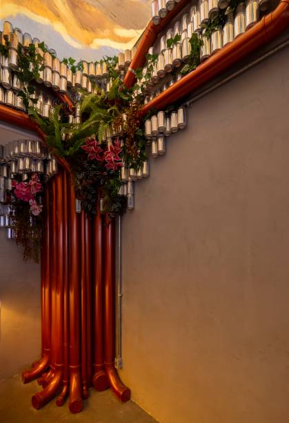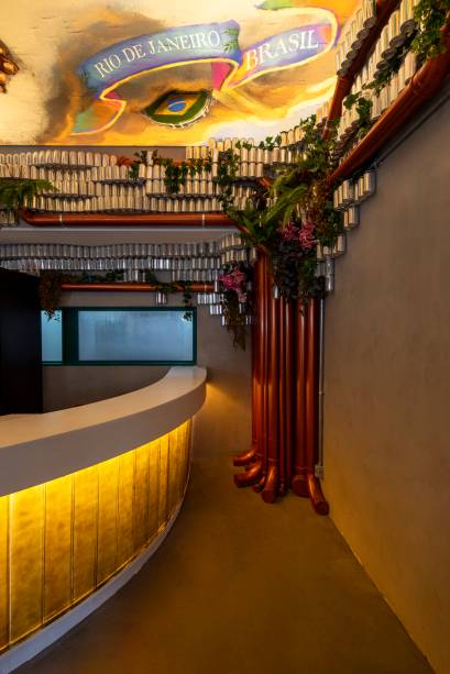 Para completar o acesso ao paraíso do Mussum, o balcão principal foi especialmente desenvolvido para remeter a um grande copo americano cheio de cerveja, com direito a colarinho. Estudos e testes foram feitos pelo time do escritório para que as proporções fossem idênticas às do copo, um clássico dos botecos. A tonalidade aplicada no vidro foi resultado de estudos do Atelie Benini, que estudou a Cerveja Cacildis, marca que também homenageia Mussum, para chegar à cor ideal. A iluminação em LED destaca as bolhas, aumentando ainda mais a sensação de um copo recém-servido.