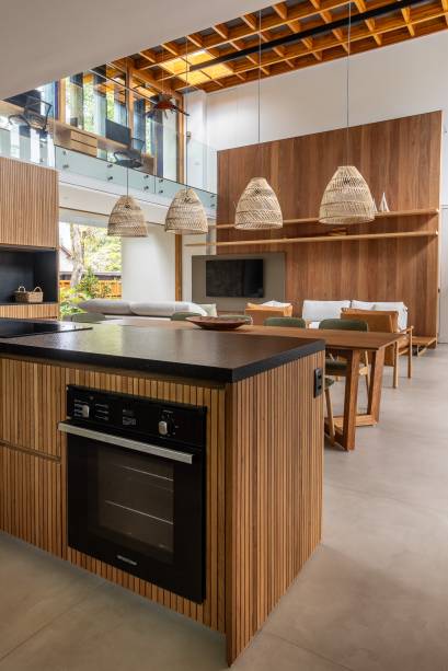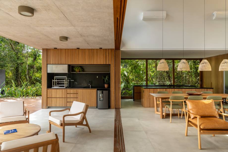 O projeto da casa foi desenvolvido para se abrir completamente para o exterior. “Com a utilização de grandes painéis de correr, brises móveis e beirais extensos, buscamos garantir a integração dos ambientes internos com os externos, mas sem perder a proteção necessária para o conforto da família”, diz Rodrigo Alves Pereira.
