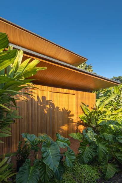 “A cobertura com beirais chanfrados foi uma escolha estratégica para suavizar as linhas da construção e proporcionar um diálogo harmonioso com o ambiente natural. Além disso, a ventilação cruzada e as aberturas generosas garantem que a casa se mantenha fresca e iluminada”, afirmam os arquitetos.