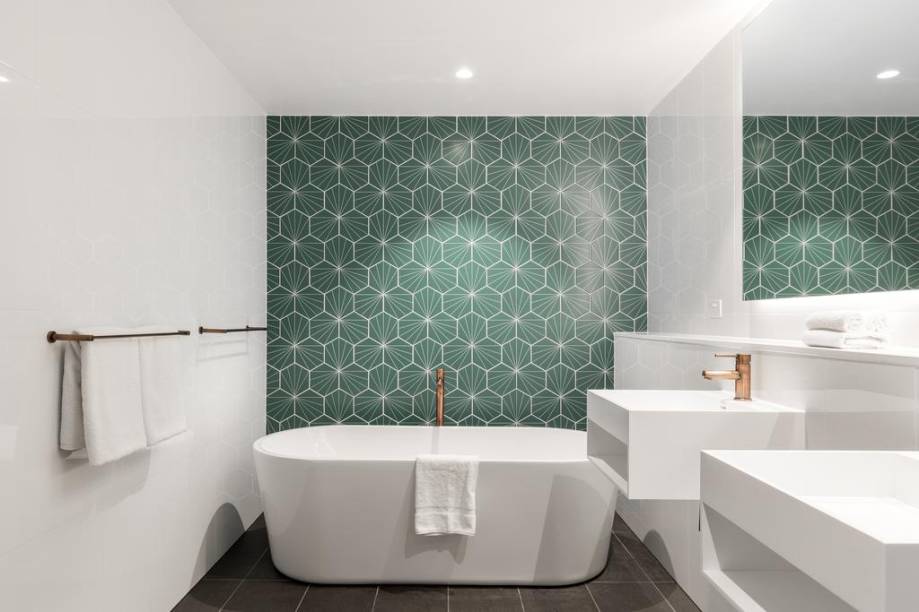 Os quartos foram cuidadosamente decorados. São espaços amplos com dois ambientes (quarto e sala de estar) separados pela televisão. Os banheiros contam com azulejos turquesa em formato hexagonal destacados por conta das louças brancas.