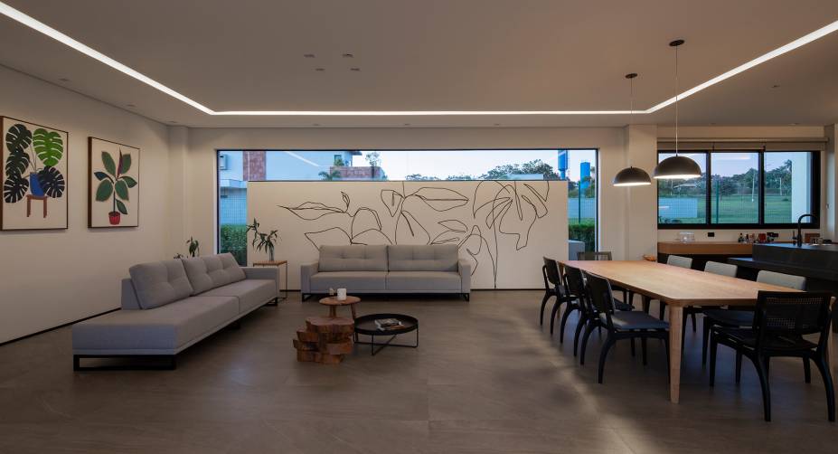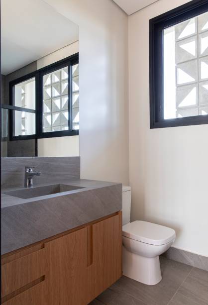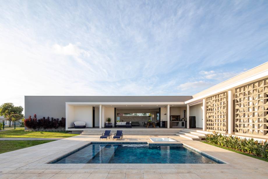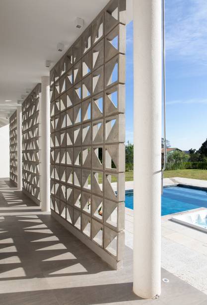O pé-direito livre de 3,20 m proporciona uma atmosfera sempre arejada nos espaços. Bem brasileiro, o cobogó rouba a cena da casa e injeta bossa extra à narrativa arquitetônica do projeto – o revestimento ainda garante a refrigeração permanente dos interiores, além de uma luz rendada cheia de poesia nos dias mais ensolarados.