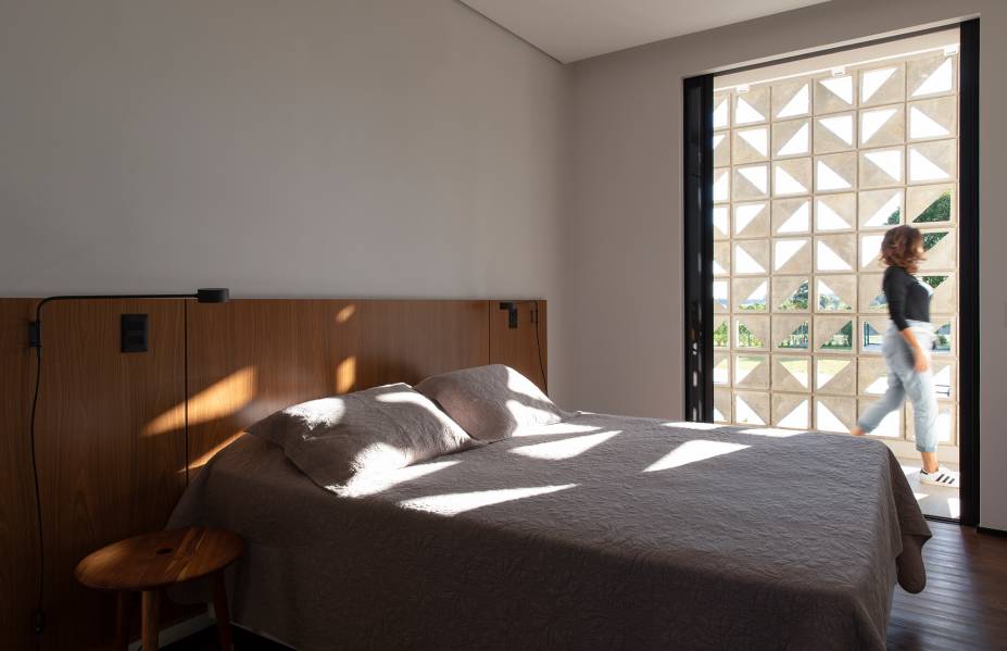 Na área íntima dos proprietários, os quartos do casal e dos filhos estão isolados – o que garante o descanso tranquilo dos usuários. Um elemento vazado foi estrategicamente aplicado na superfície, em frente aos quartos, com o objetivo de alcançar privacidade extra e proteção solar.