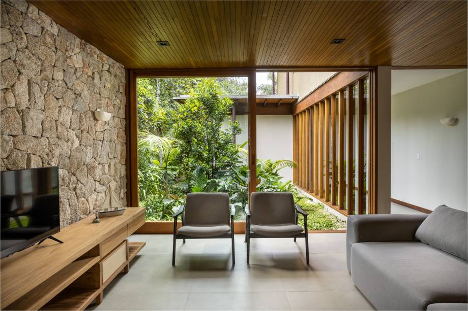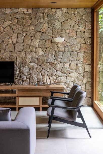 O escritório Pitta Arquitetura utiliza materiais como madeira, pedra e grandes painéis de vidro para criar ambientes que se conectam com a natureza.