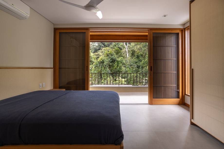 O andar superior abriga 3 suítes amplas, todas com grandes janelas que proporcionam vistas privilegiadas da copa das árvores e da área verde. A suíte máster possui uma sacada com vista para a piscina e a vegetação.