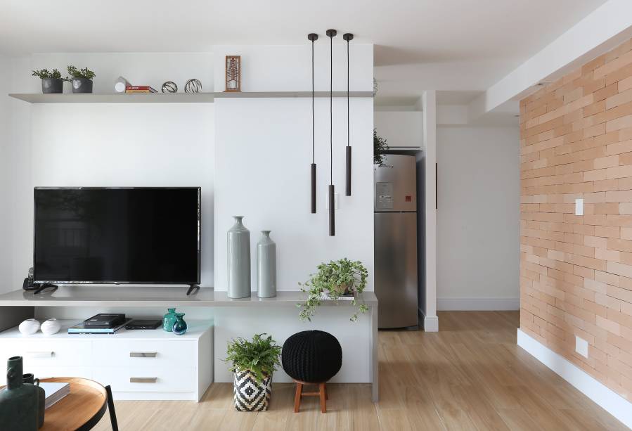 Para atender às necessidades da moradora, as paredes de um dos quartos vieram abaixo e deram lugar a um amplo living que foi integrado com a varanda, o que garantiu mais iluminação natural. Os armários da cozinha foram desenvolvidos em integração com a sala. De um lado funcionam como painel para a TV; do outro, como despensa.