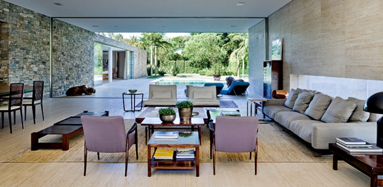 1/11 O olhar atravessa da entrada ao jardim, mérito da planta livre de colunas e divisórias na área de estar. A formalidade visual é compensada pela combinação de materiais quentes, como a pedra moledo (Pedras Bellas Artes), aplicada nos paredões principais, embaixo, e a madeira das venezianas dos quartos, em cima. Estas escondem, por dentro, um guarda-corpo de vidro com perfis embutidos, além de painéis de vidro em molduras de alumínio, para total vedação. (Foto: Edgard Cesar)