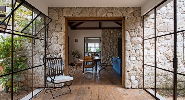 A casa de 375 m² ficou pronta no ano passado, mas, por alguma razão, parece estar ali há muito tempo. “Mesmo antes da chegada dos móveis, ela já tinha bastante vida”, afirma a arquiteta Regina Strumpf, autora do projeto ao lado de Rogério Gurgel, ambos sócios no RSRG Arquitetos. Essa sensação abstrata talvez possa ser explicada pela escolha dos materiais rústicos que revestem fachada, paredes e pisos: pedra bruta, tijolo de obras antigas e madeira de demolição. Junto das janelas e portas pintadas de azul e do ferro presente em delgadas esquadrias, os acabamentos bebem na referência provençal, o único pedido do proprietário. “No entanto, não moramos na Provença e tampouco queríamos desenhar um caixote. Fizemos então uma leitura conceitual do estilo, usando dois corpos de concreto moldado e blocos cerâmicos ligados por um elemento de transição, uma espécie de passarela envidraçada”, afirma Regina. Com telhado em duas águas, os dois volumes – um deles tem até chaminé – evocam a imagem do típico refúgio no campo. Como contraponto, além do corredor central de linhas retas, contribuiu o detalhamento da fachada. “Queríamos que as construções ficassem contidas entre as quatro empenas de pedra, que exibem todas a mesma altura”, explica Rogério Gurgel.