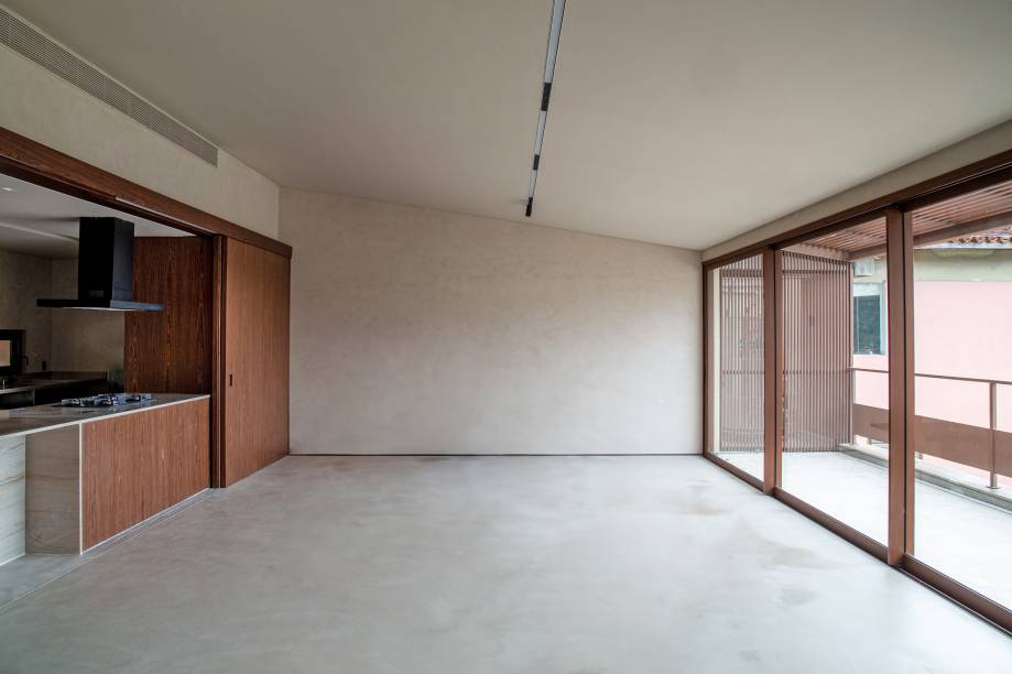 Até mesmo a escolha dos revestimentos está relacionada à busca por uma identidade, como o reuso do piso de tábua-corrida no pavimento térreo, proveniente da fazenda da família, ou o uso do piso de concreto queimado nos espaços comuns, evocando afetivamente a conexão interiorana dos moradores.