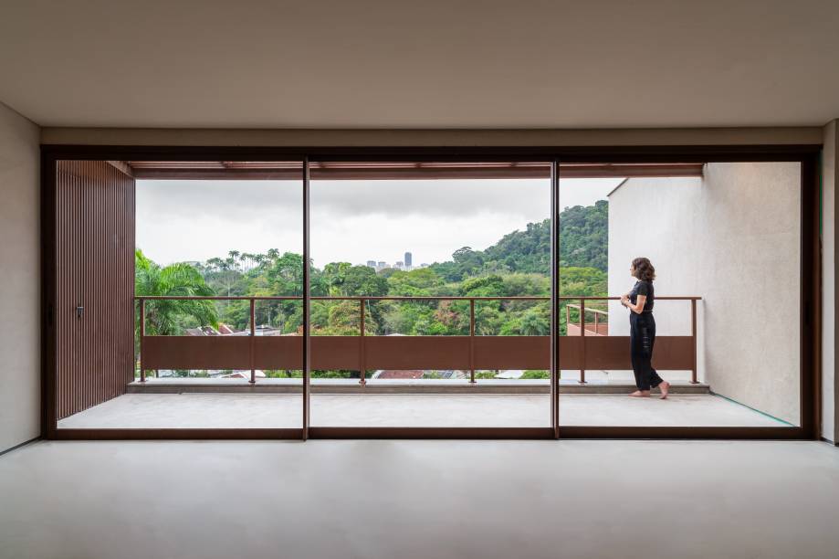 No pavimento superior estão sala e cozinha, com grandes varandas que se debruçam sobre a paisagem, e piscina, que se aproveita da maior incidência do sol no andar mais alto.
