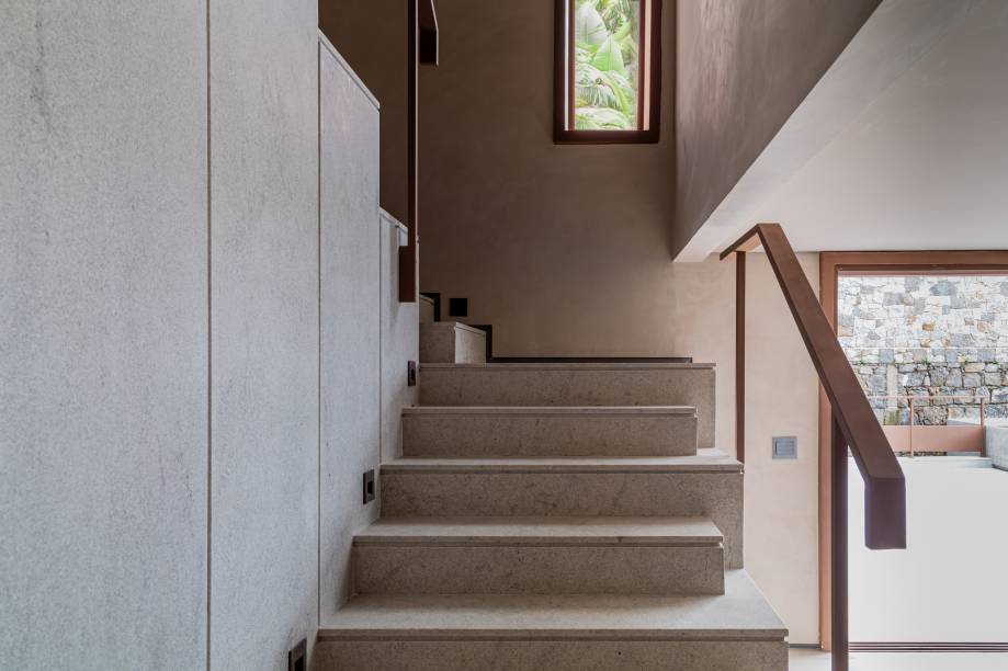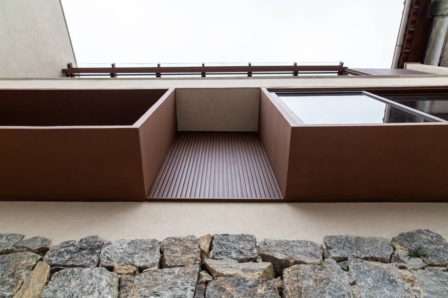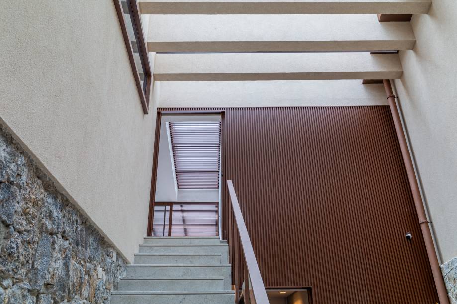 O desenho de um pátio coberto, com iluminação zenital, introduz a escada de acesso junto ao antigo “muro” de pedra, enraizando a casa em seu lugar de memória, além de criar um grande momento de recepção.