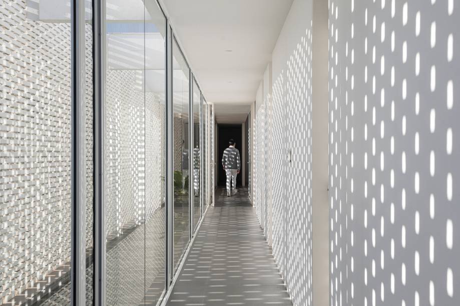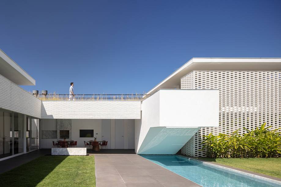 Tijolos brancos compõem a fachada vazada desta casa de 600 m² em Brasília