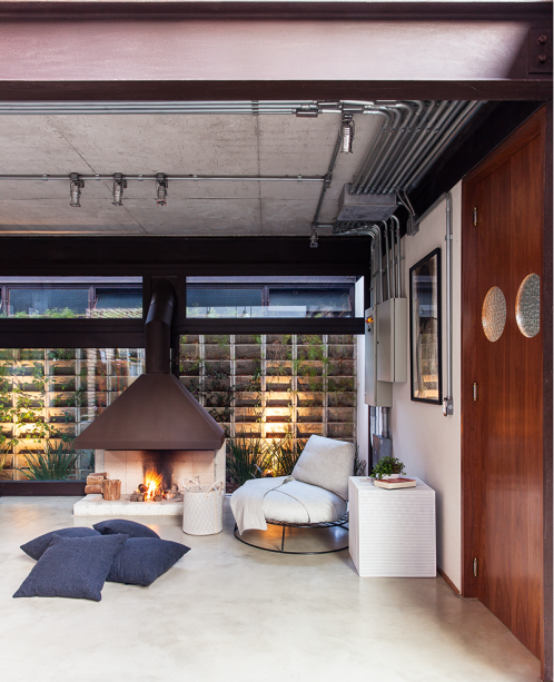 A churrasqueira, no canto da sala, é valorizada pelo cimento queimado (Tecnocimento, da NS Brazil) aplicado na divisória. Confira as outras boas ideias desta proposta do escritório ILLA nesta reportagem. (Foto: Marcelo Donadussi)