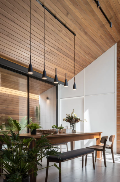 Mas nem tudo no imóvel tem abertura como palavra de ordem – uma cerca de ripas do lado de fora funciona como uma fachada dupla para a casa, reforçando a sensação de privacidade no interior.