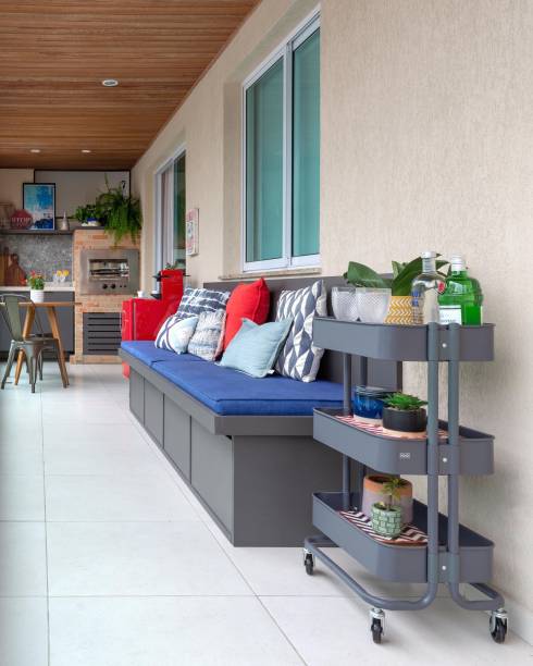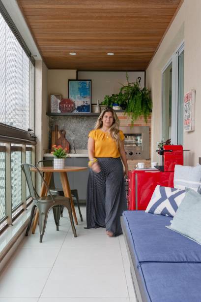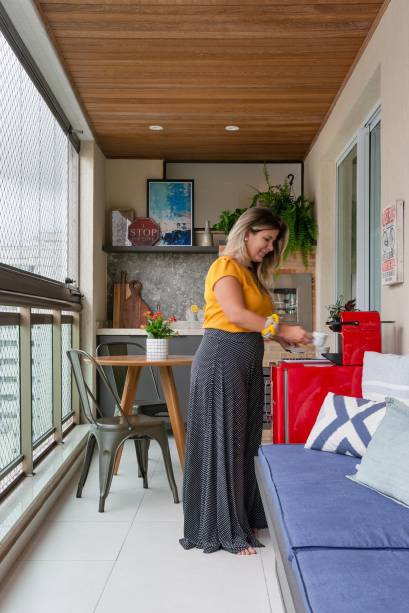 Já a varanda ganhou atenção especial no projeto. Originalmente, o espaço tinha uma churrasqueira elétrica revestida de tijolinhos, que o casal pensava em aproveitar. Assim, Amanda desenhou uma prateleira sobre ela para apoiar plantas, além de armários sob a bancada e um banco com gavetões embaixo para guardar brinquedos. Um frigobar de modelo retrô vermelho serve de apoio para o café e um móvel com rodinhas serve para apoiar bebidas, plantas e livros. Uma pequena mesa ainda permite que os moradores façam pequenas refeições por ali.