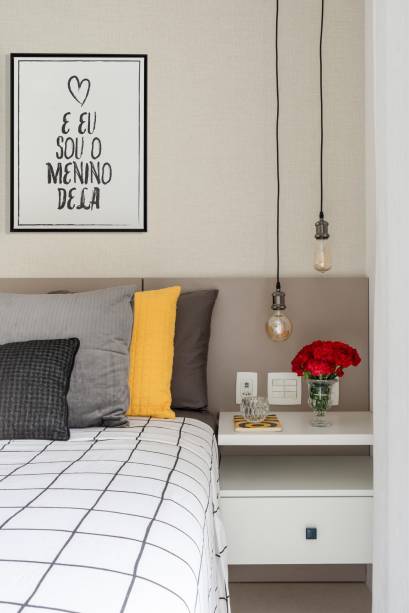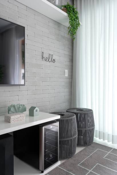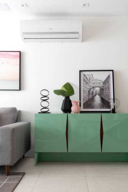 A decoração tem uma pegada contemporânea, com toques do estilo industrial. O tijolo na parede da sala de TV e elementos pretos, como luminárias e enfeites, cumprem o papel de trazer esse efeito. Mas, para os ambientes não ficarem pesados, entraram em cena cores suaves, como o verde menta. E, para aquecer, a madeira aparece em alguns móveis da sala.