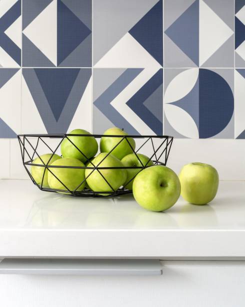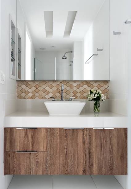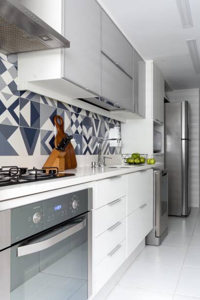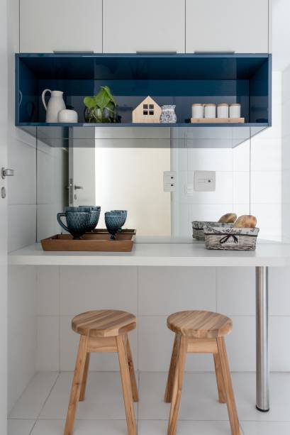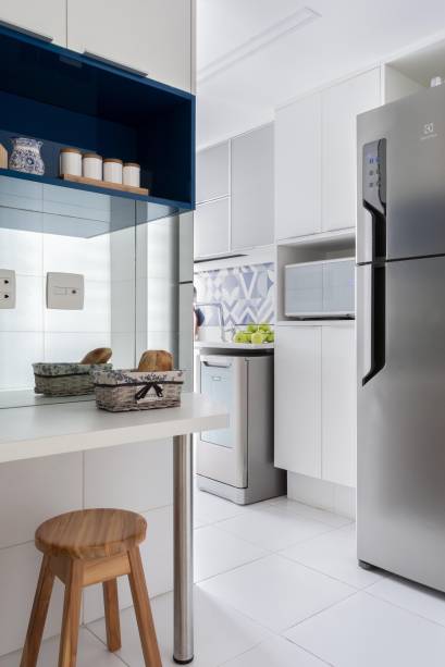 Em formato de corredor, a cozinha tem uma pequena bancada de refeições rápidas com fundo espelhado para o espaço parecer maior. Como os moradores pediram um ambiente claro, mas com toque de cor, Amanda escolheu o tom azul para colorir o nicho superior do armário e as cerâmicas com estampa geométrica.