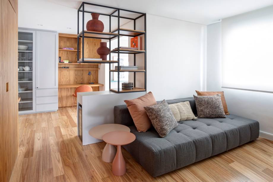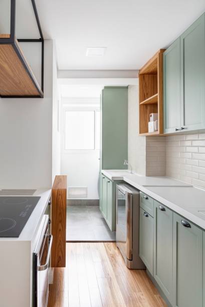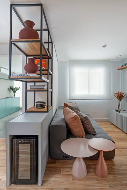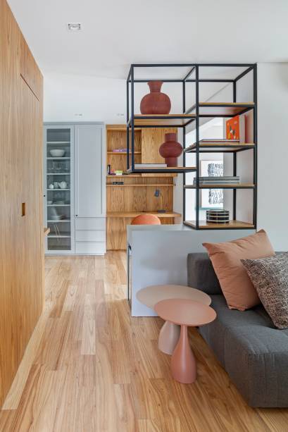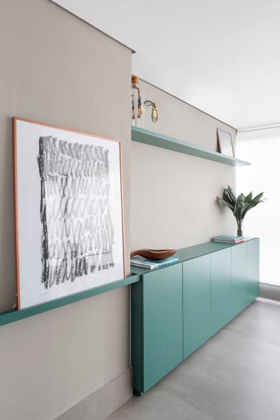 Atrás do sofá, desenharam uma estante de laca cinza e serralheria, com a parte superior vazada. A peça serve de apio para o sofá e também abriga uma adega. Na paleta, predominam os tons claros, como o verde pastel usado nos armários da cozinha, o cinza da marcenaria da sala e o branco no quarto do casal. Além disso, o freijó pontua todo o apartamento trazendo sensação de conforto e aconchego.