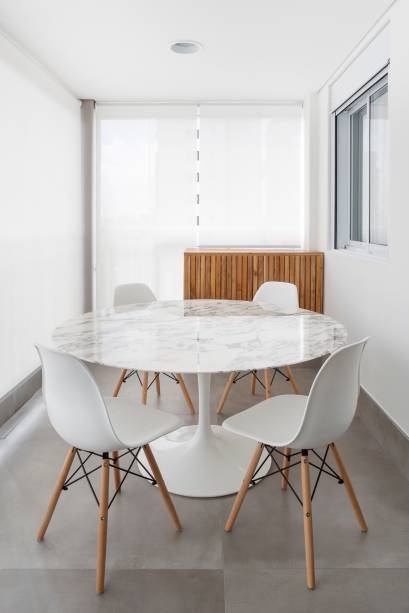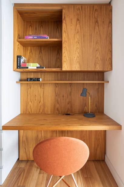 A marcenaria, aliás, é o grande trunfo deste projeto e fez o espaço render. As profissionais desenharam uma bancada entre a sala e a cozinha, que foi feita de Corian, com cooktop para que os moradores pudessem fazer as refeições do dia a dia de uma forma descontraída. Esse elemento também reforça a ideia de integração dos ambientes.
