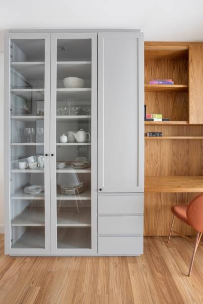 A bancada da lavanderia, também feita de Corian, é uma continuação da cozinha e traz também funcionalidade para este ambiente. Na sala, Ana e Flavia projetaram um móvel para ser usado como cristaleira, fazendo com que a cozinha se estenda até o ambiente. Como continuação desta marcenaria, elas criaram um canto de escritório bem charmoso e prático.
